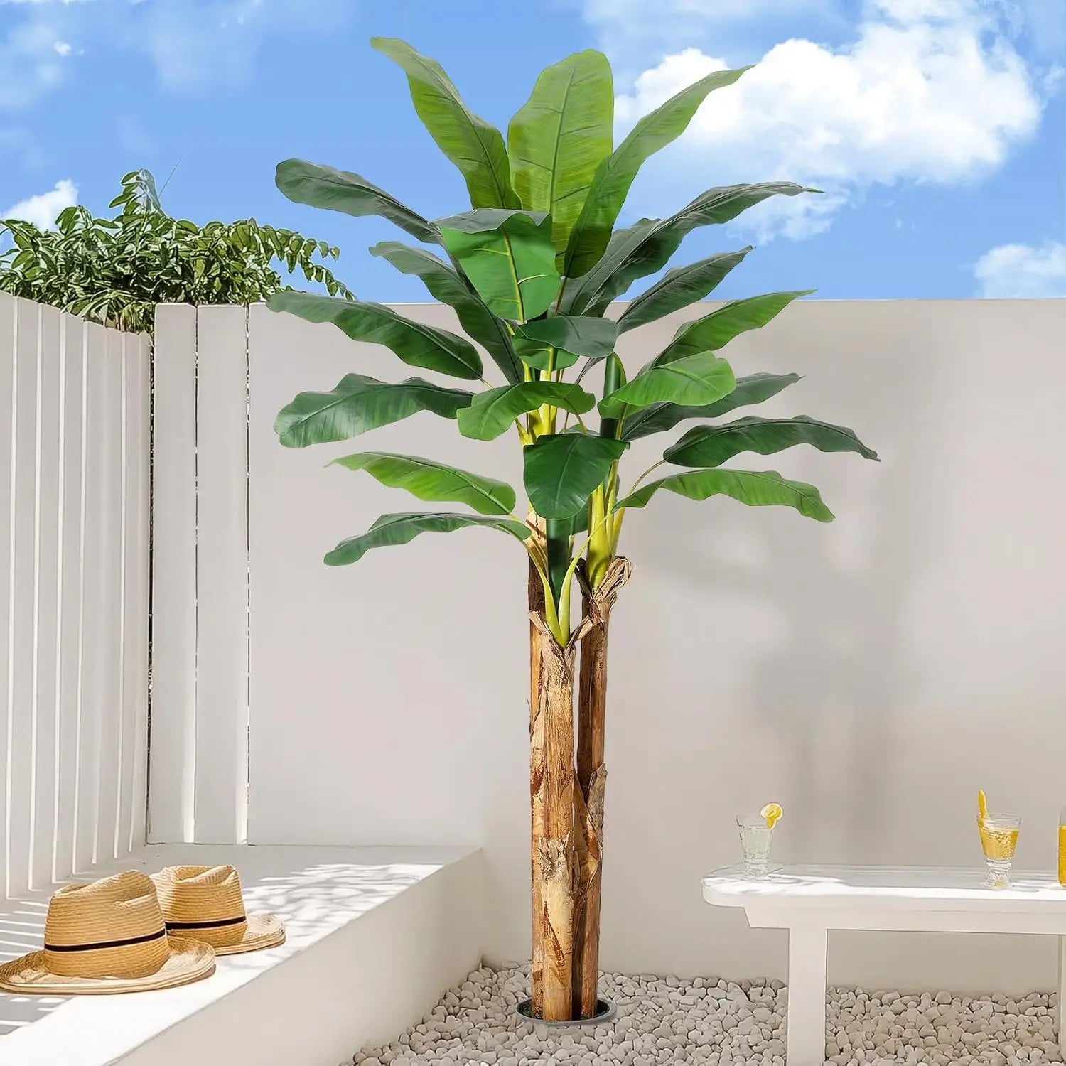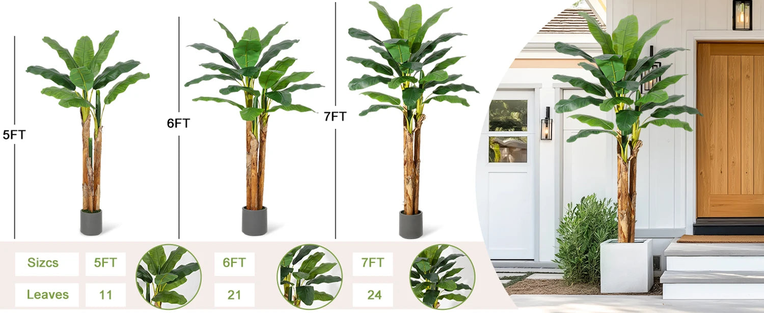 - Lifelike realism in 7ft, 6ft, or 5ft sizes — you’ll enjoy large PE leaves, natural stalks, and a textured banana bark in a grey planter with simulated moss.