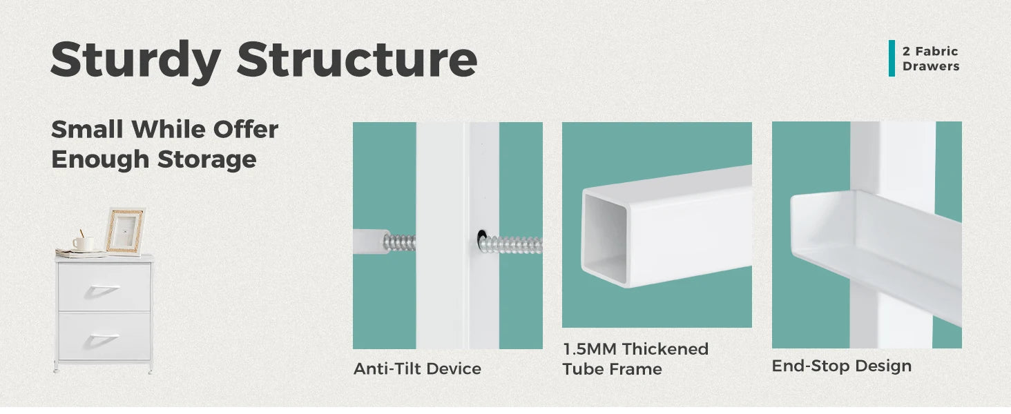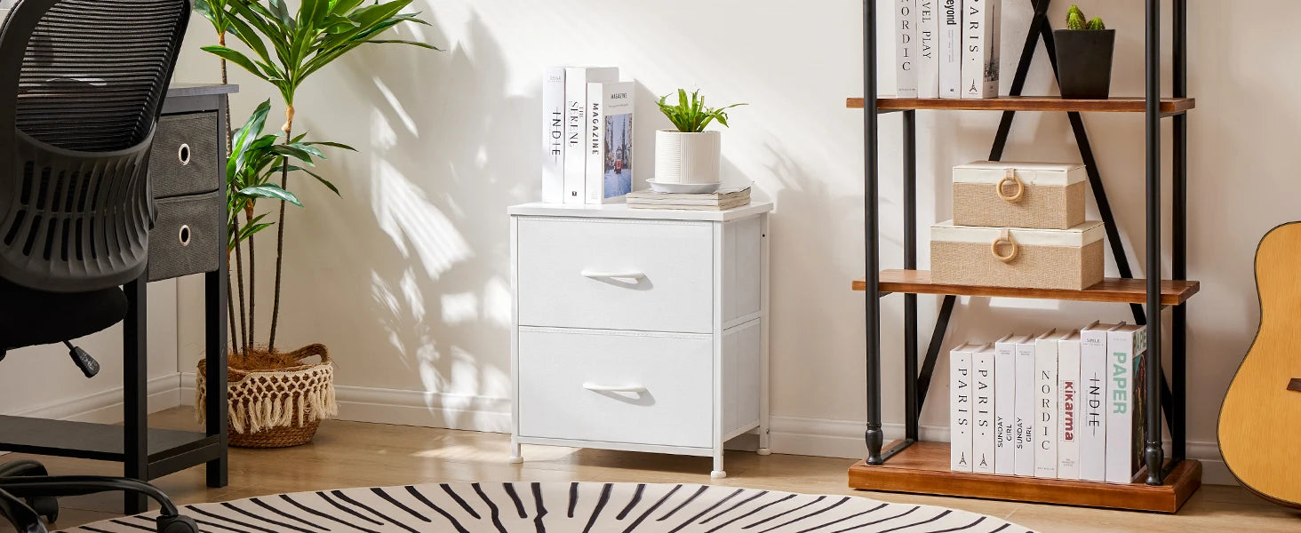 - You get a versatile set of 2 cabinets with two removable fabric drawers to organize clothes, books, toys, or snacks, while the wooden tops keep alarms, phones, and glasses within easy reach.